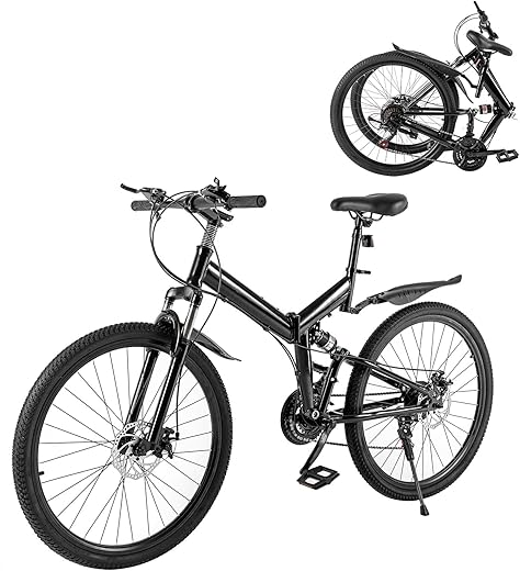- 🚴‍♂️Foldable & Adjustable — This 26″ mountain bike’s saddle can be adjusted between 80-95cm/ 31.5-37.4in, so you can adjust the height according to your comfort. When folded, its size is only 37.4*13.77*39.37in, you can fold it up and put it in the garage, trunk, etc. to save space when you are not using it.